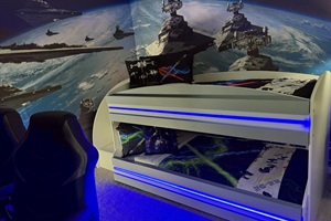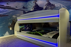 ~ Star Wars Bunk Room with twin bunk beds and vibrant, galactic wall art and LED lighting, 50" Smart TV